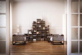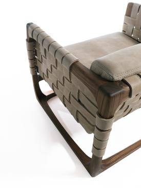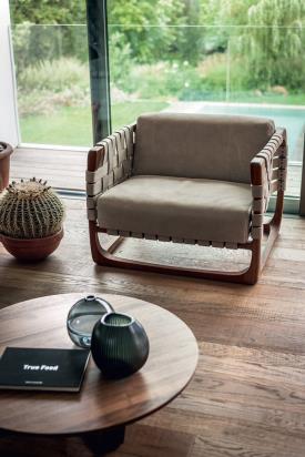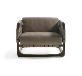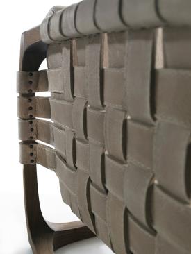 Fauteuil rembourré avec une structure en bois massif entièrement tournée, assemblée et poncée à la main. Un tissage de cordes en cuir ou en tissu caractérise l'assise, le dossier et les accoudoirs. Dans la version en tissu, un renfort structurel est prévu à l'intérieur du revêtement.