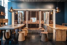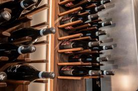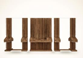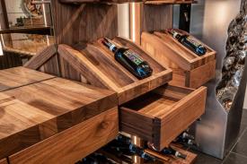 Système modulaire ouvert adapté à la présentation de collections de vins, composé de panneaux de boiserie en bois plaqué avec des supports en bois massif pouvant accueillir des bouteilles de taille standard, alternant avec des modules verticaux en métal miroir profilé finition Irondust. Des présentoirs spéciaux inclinés en bois massif permettent de mettre en valeur les bouteilles. La partie inférieure dispose de plus d'espace pour accueillir les bouteilles de grand format. Des tiroirs assemblés en queue d'aronde traditionnelle complètent la structure, permettant de ranger tout le nécessaire à la dégustation. Possibilité de rétro-éclairage des panneaux avec des profils LED.