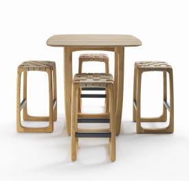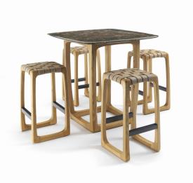 Tabouret de bar avec structure en bois massif tourné, assemblé et poncé entièrement à la main, avec repose-pieds pratique en fer. L'assise est caractérisée par des bandes entrelacées de cuir ou de tissu. Lorsqu'elles sont en tissu, ces bandes ont un support structurel à l'intérieur.